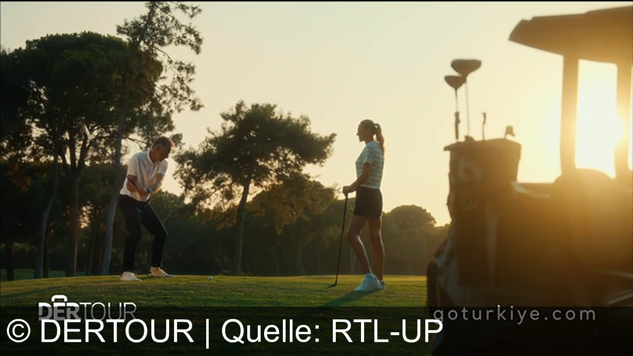 Zwei Personen auf einem Golfplatz. Eine Person schlägt mit einem Golfschläger. Die andere steht daneben und hält einen Schläger. Im Vordergrund ein Golfbag. Hintergrund zeigt Bäume und Sonnenuntergang. Links unten steht "DERTour", rechts unten "goturkiye.com".