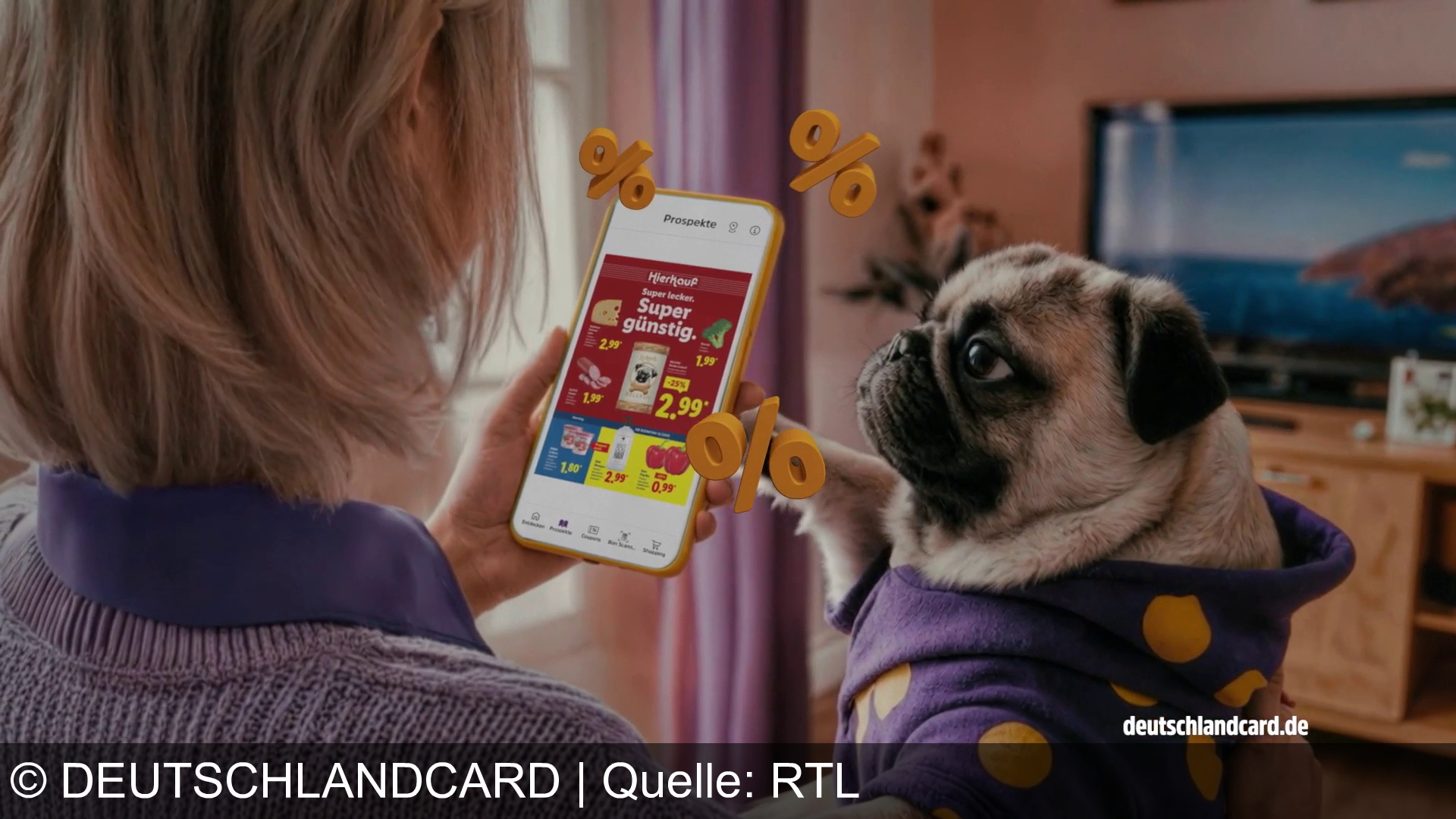 Eine Frau hält ein Handy mit der Anzeige von Prospekten. Ein Mops im lila Pullover schaut das Display an. Gelbe Prozentzeichen schweben um das Handy. Im Hintergrund läuft ein Fernseher. Unten rechts steht "deutschlandcard.de".