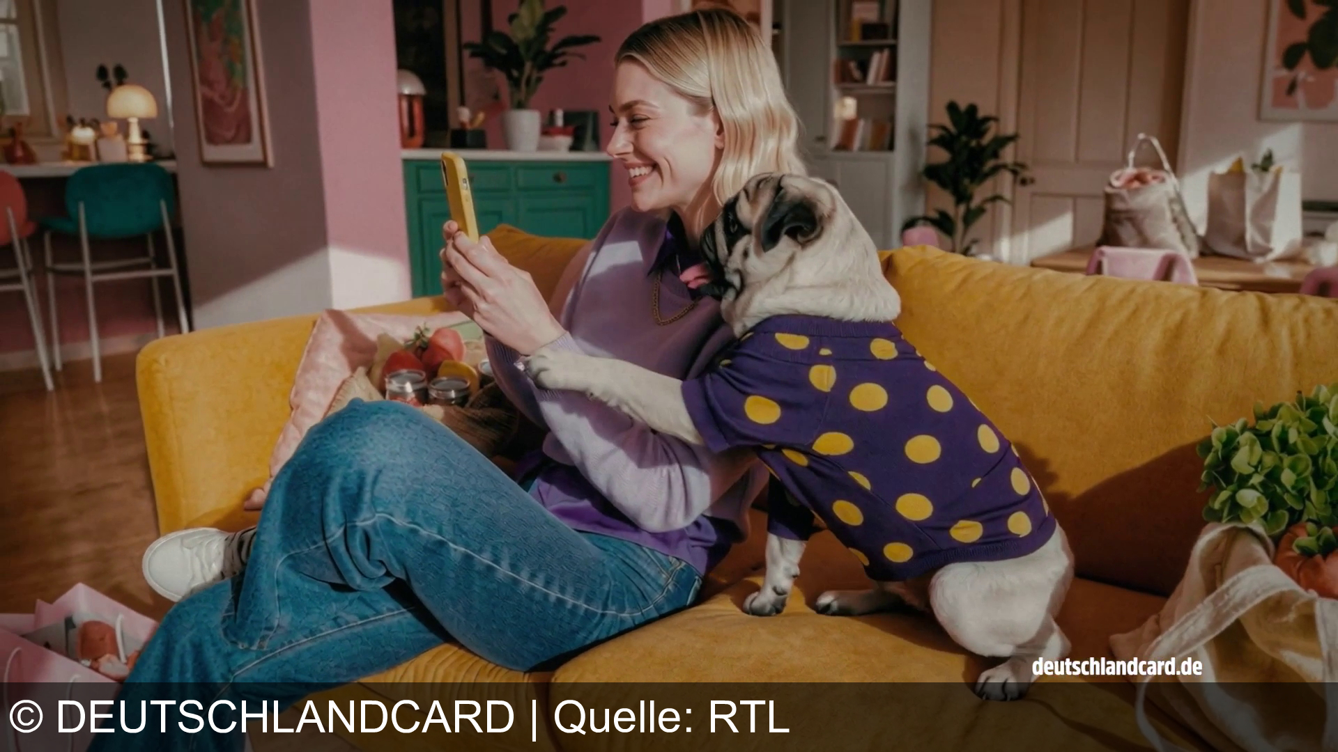 Eine Frau sitzt auf einem gelben Sofa, tippt auf einem Smartphone. Neben ihr ein Mops im Pullover. Einkaufstaschen und Pakete auf dem Boden und Sofa. Im Hintergrund ein Esstisch mit pinken Stühlen, eine stehende Lampe und Pflanzen. Raum in warmen Farben, Stickers mit "deutschlandcard.de" unten rechts auf dem Bild.