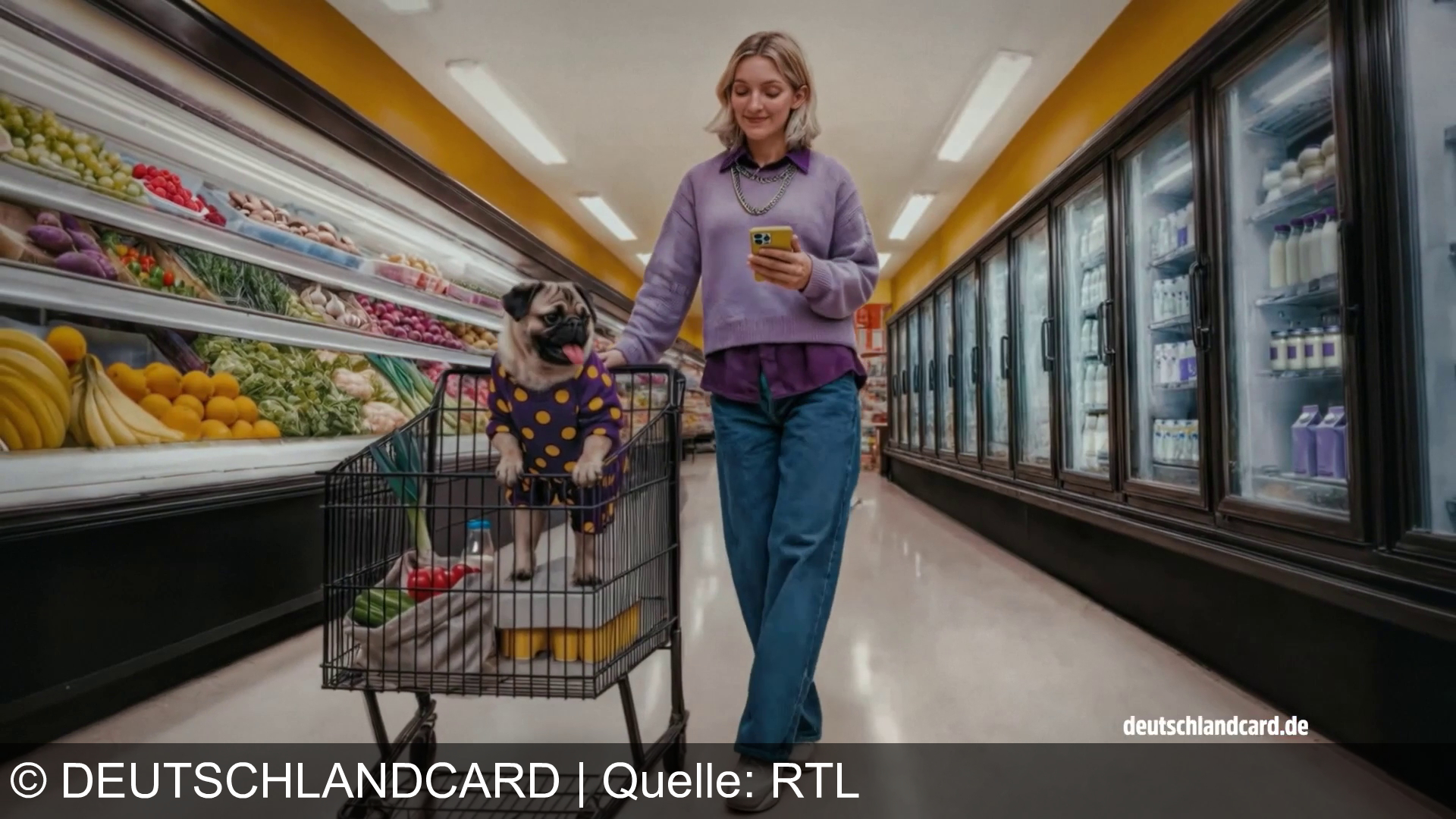 Eine Frau im lila Pullover läuft mit einem Einkaufswagen durch einen Supermarkt. Im Wagen sitzt ein Mops in einem bunten Outfit. Links sind Regale mit Obst und Gemüse, rechts Kühlschränke mit Milchprodukten. Die Frau schaut auf ihr Smartphone. Unten rechts steht "deutschlandcard.de".