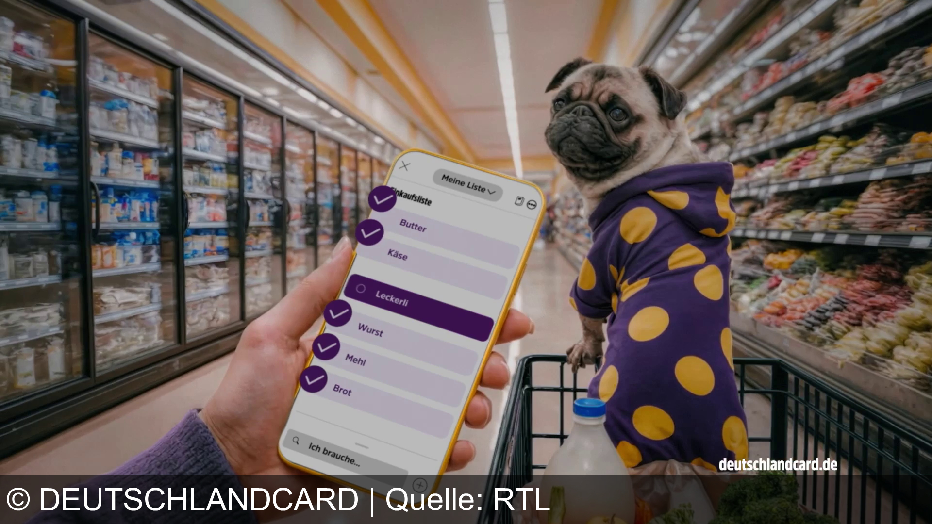 Eine Hand hält ein Smartphone mit einer Einkaufsliste. Ein Mops sitzt im Einkaufswagen, trägt einen lila Pullover mit gelben Punkten. Im Hintergrund sind Supermarktregale mit gekühlten Produkten und frischem Obst oder Gemüse zu sehen. Auf der Liste stehen Butter, Käse, Leckerli, Wurst, Mehl und Brot. Deutschlandcard-Logo ist unten rechts.