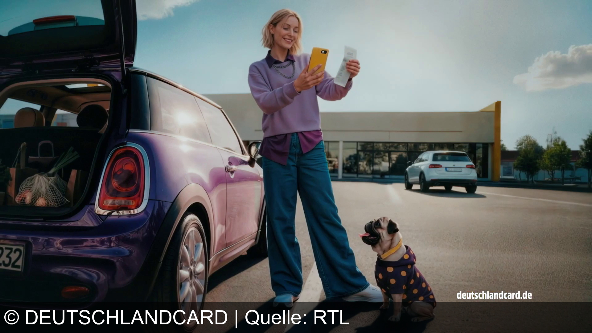 Eine Frau steht lächelnd neben einem lila Auto mit offenem Kofferraum. Sie hält ein gelbes Handy und einen Kassenzettel. Ein Mops sitzt vor ihr, trägt ein gepunktetes Outfit. Im Hintergrund ist ein Gebäude und ein fahrendes Auto zu sehen. Unten rechts steht "deutschlandcard.de".