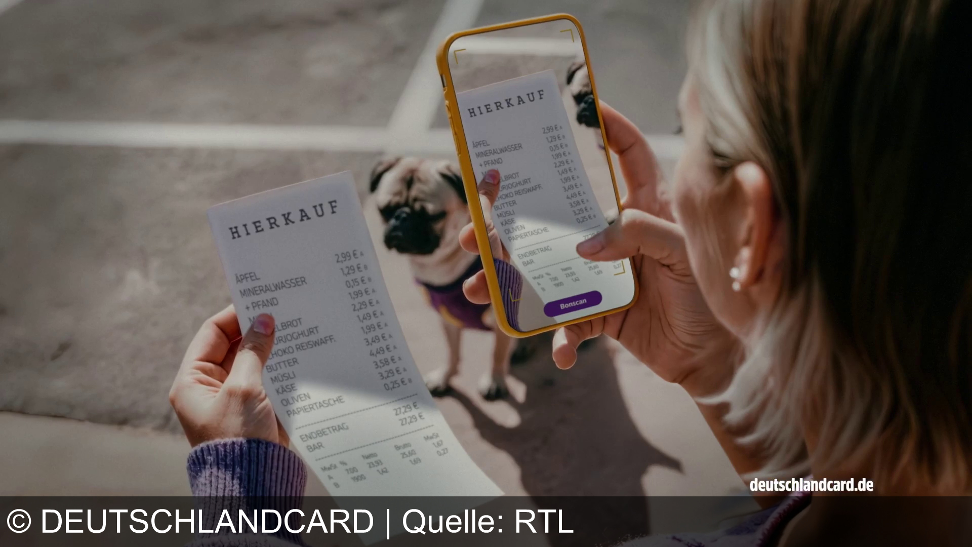 Eine Person scannt einen Kassenbon mit einem gelben Smartphone. Der Bon enthält Artikel wie Apfel, Mineralwasser und Pfand. Im Hintergrund befindet sich ein Mops mit lila Kleidung. Unten rechts steht "deutschlandcard.de".
