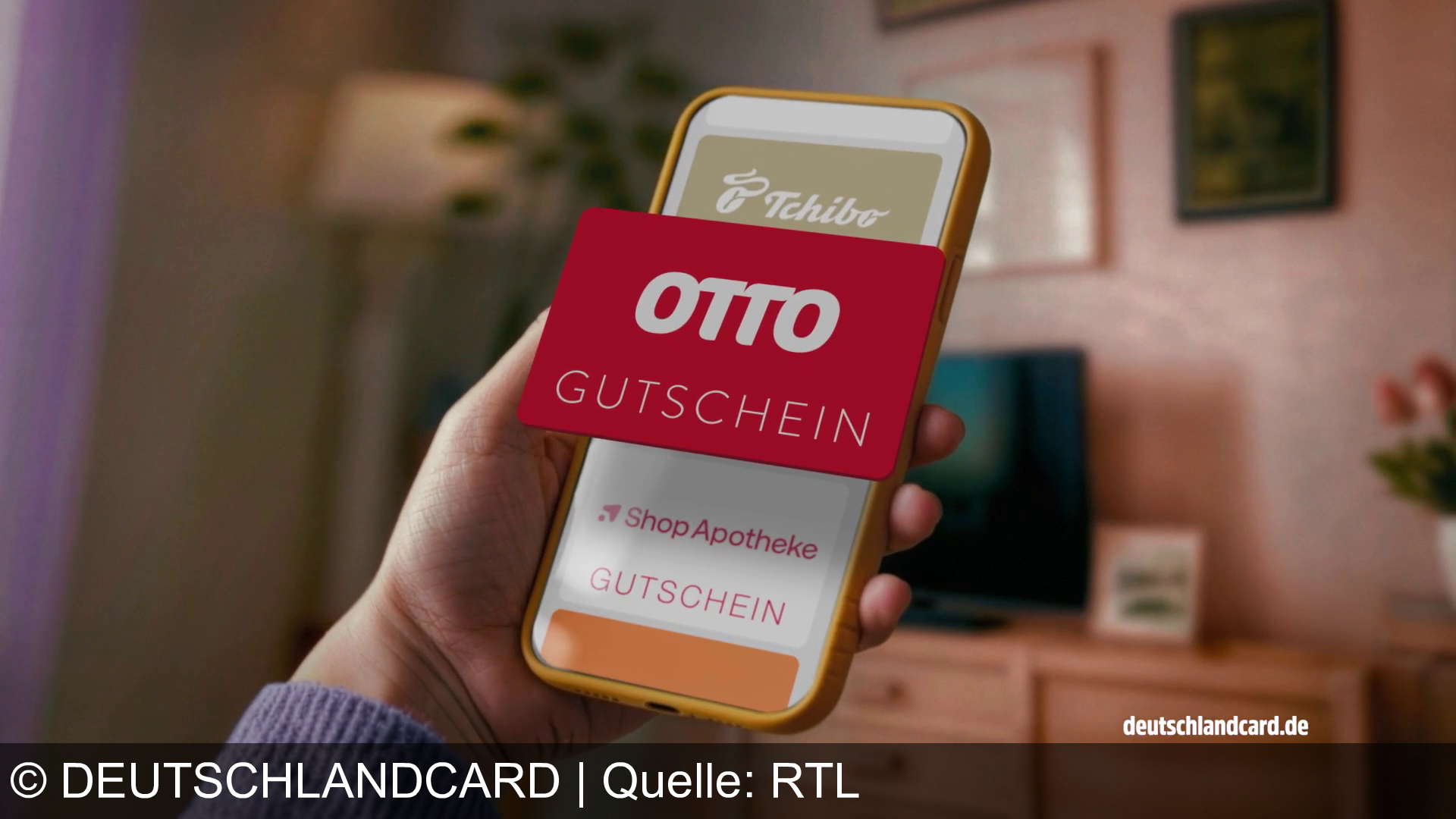 Eine Hand hält ein Smartphone mit gelber Hülle. Auf dem Display stehen Tchibo und Shop Apotheke. Ein roter Gutschein von OTTO überlagert das Display. Im Hintergrund befinden sich ein unscharfer Raum mit Möbeln, einer Lampe und Blumen. Unten rechts ist die URL deutschlandcard.de zu sehen.