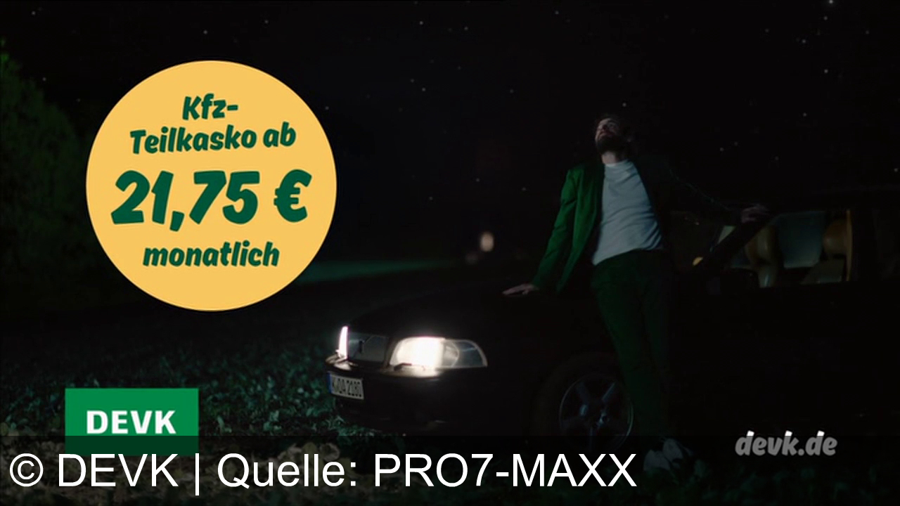Ein Mann in einem grünen Anzug lehnt nachts an einem Auto mit eingeschaltetem Scheinwerfer. Oben sind Sterne zu sehen. Links ist ein gelber Kreis mit dem Text „Kfz-Teilkasko ab 21,75 € monatlich“. Unten links das grüne Logo „DEVK“, unten rechts „devk.de“.