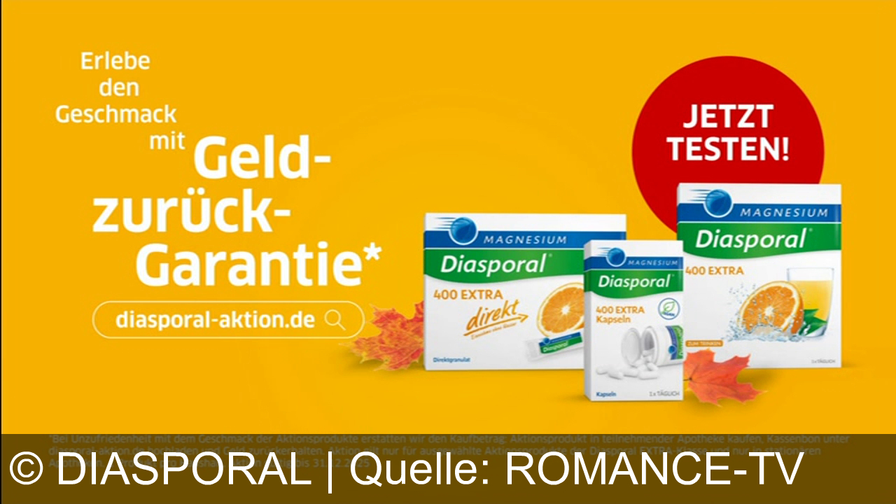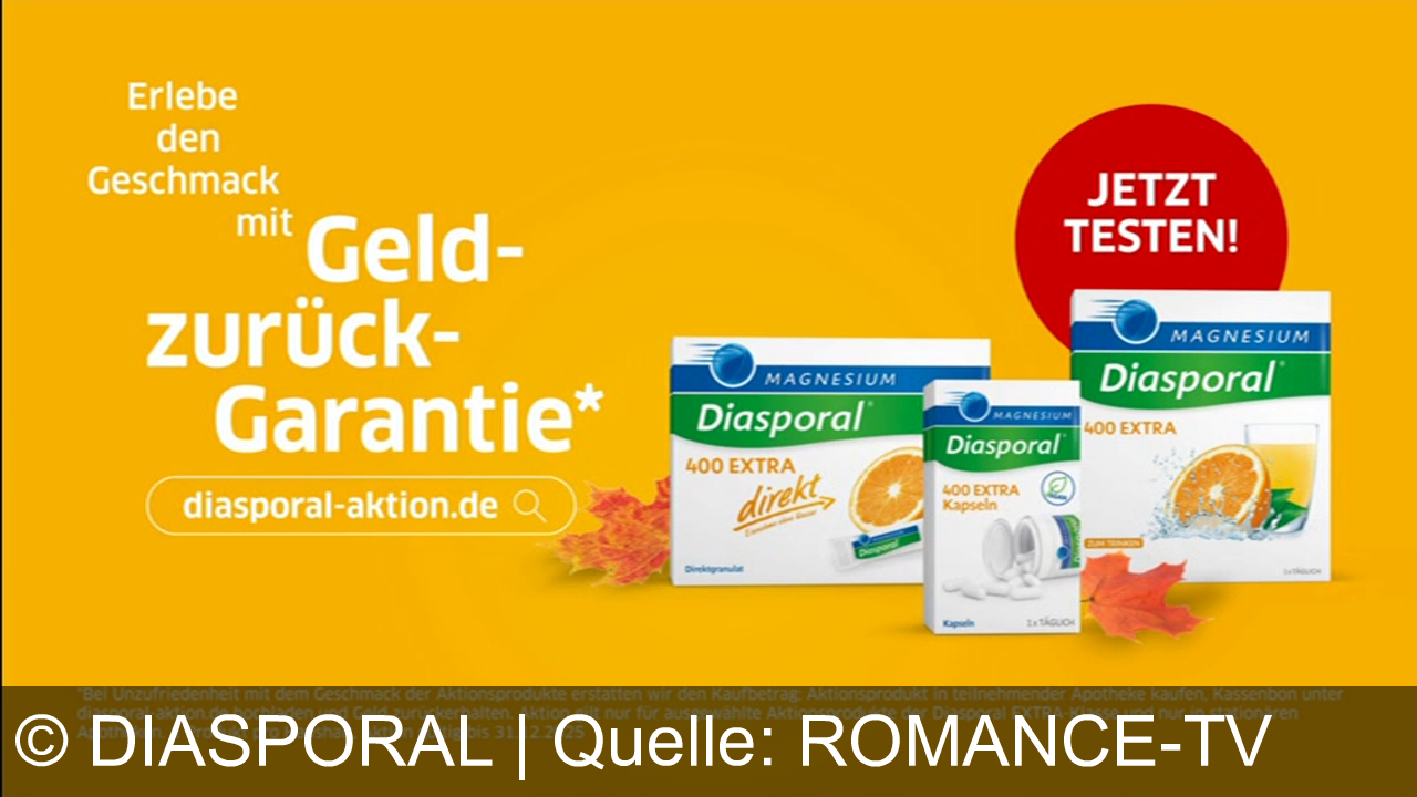 Werbung aus dem Jahr 2025 von Diasporal in Deutschland, mit dem von uns gewählten Titel: "Magnesium Diasporal 400 EXTRA: Extra starke Unterstützung für normale Muskelfunktion risikofrei testen" mit der Kurzbeschreibung: "Mit Diasporal Magnesium 400 EXTRA: Extra stark, schnell, fruchtig – spüre neue Power bei jedem Ziel! Jetzt risikofrei testen mit Geld-zurück-Garantie auf diasporal-aktion.de.". Diese Werbung thematisiert oder beinhaltet die Kategorie/n Nahrungsergänzung, Gesundheit.