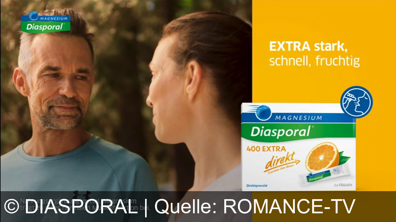 Ein Mann und eine Frau stehen sich im Freien gegenüber, beide lächeln. Rechts ist eine Verpackung von "Magnesium Diasporal" mit einer Orange abgebildet. Darüber steht "EXTRA stark, schnell, fruchtig". Unten links im Bild sind kleine Schriftzüge, die auf die Funktion von Magnesium hinweisen.