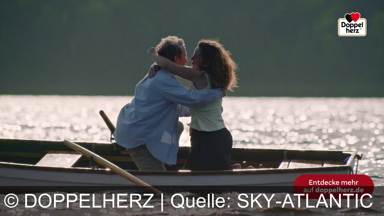 Ein Paar umarmt sich in einem Ruderboot auf einem See. Sonnenschein spiegelt sich auf dem Wasser. Links sieht man Ruder im Boot. Oben rechts das Logo von Doppelherz, unten rechts ein rotes Banner mit der Website "entdecke mehr auf doppelherz.de".