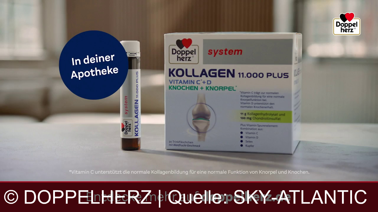 Werbung aus dem Jahr 2025 von Doppelherz in Deutschland, mit dem von uns gewählten Titel: "Doppelherz system KOLLAGEN 11.000 PLUS – Für starke Knochen und mehr Beweglichkeit" mit der Kurzbeschreibung: "Stark im Leben, stark im Moment – mit Doppelherz system KOLLAGEN 11.000 PLUS. Vitamin C & D für gesunde Knochen und Knorpel. Fühl dich aktiv, entdecke mehr auf doppelherz.de!". Diese Werbung thematisiert oder beinhaltet die Kategorie/n Nahrungsergänzung, Vitamine, Apotheke, Gesundheit, Fitness.