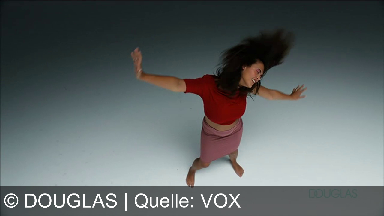 Eine Frau tanzt barfuß auf einem weißen Hintergrund. Sie trägt ein rotes Oberteil und einen rosafarbenen Rock. Ihre Haare schwingen dynamisch, während sie die Arme ausstreckt. Unten rechts steht das Logo "DOUGLAS".