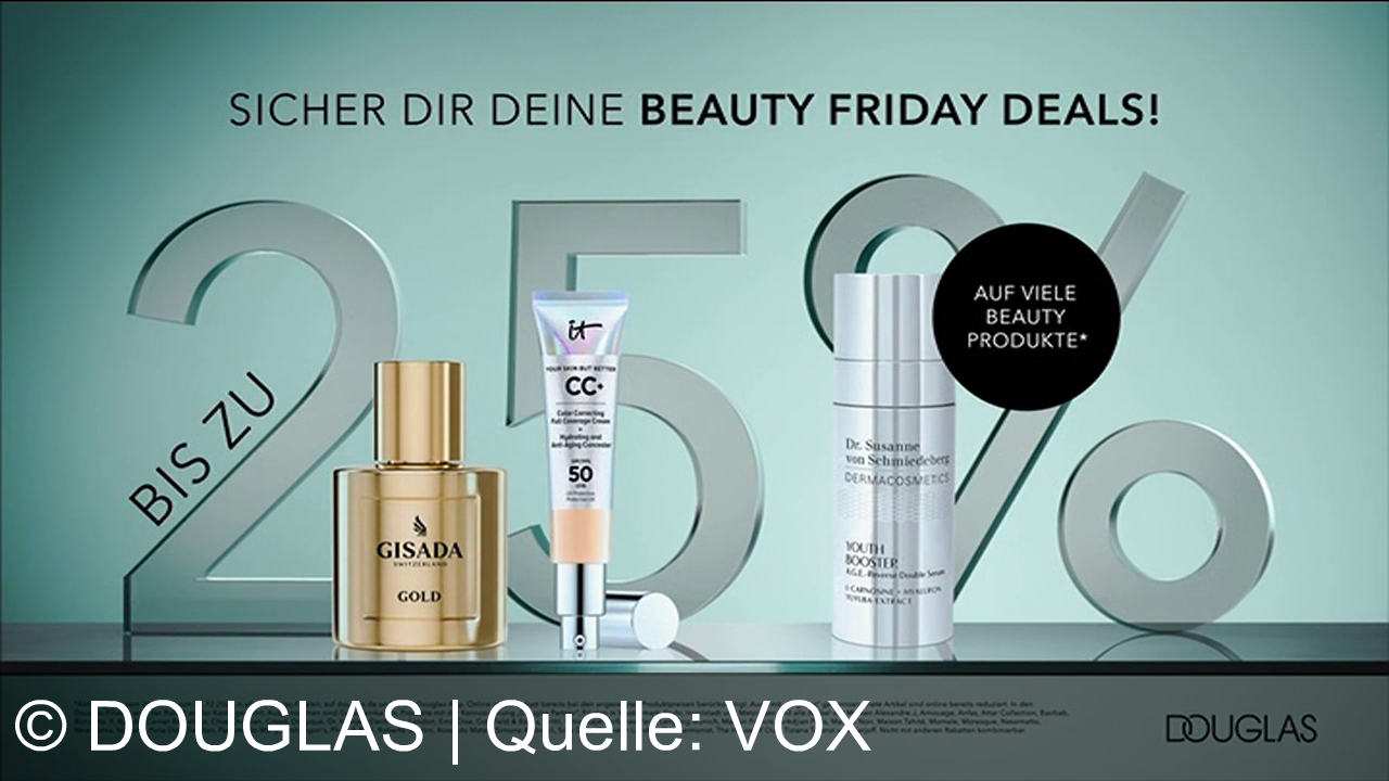 Sicher dir deine Beauty Friday Deals mit bis zu 25% Rabatt auf viele Beauty-Produkte. Drei Produkte stehen nebeneinander: Gisada Gold Parfüm, it CC+ Cream, Dr. Susanne von Schmiedeberg Youth Booster. Hintergrund ist mintgrün, schwarzer Kreis mit Text "Auf viele Beauty Produkte". Logo von Douglas unten rechts.