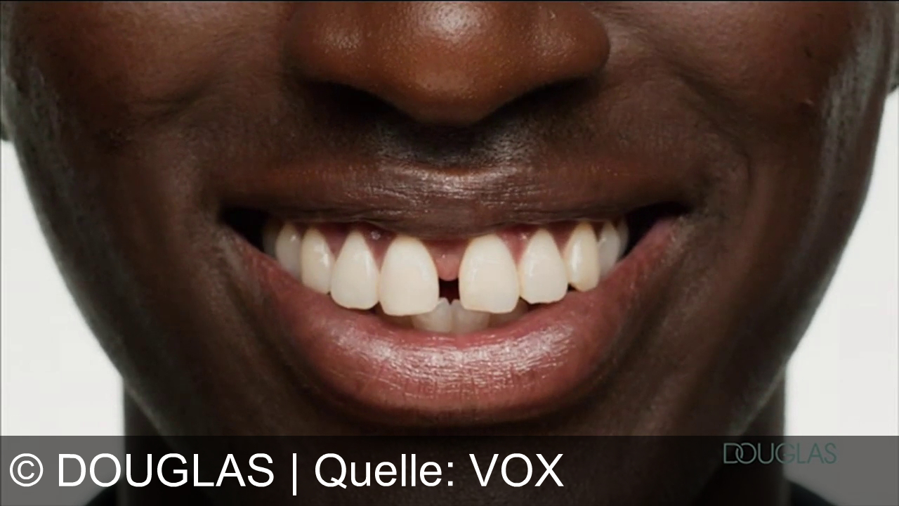 Ein nahes Lächeln mit sichtbaren Zähnen und einem kleinen Abstand zwischen den mittleren Schneidezähnen. Unten rechts steht "DOUGLAS" in blauer Schrift.