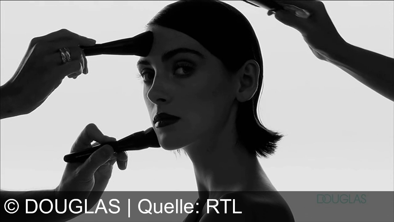 Eine Frau mit dunklem Lippenstift wird von mehreren Pinseln geschminkt. Die Haare sind glatt und zurückgekämmt. Der Hintergrund ist hell und das Douglas-Logo ist unten rechts sichtbar.