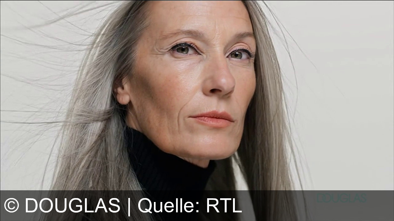 Eine Frau mit langen grauen Haaren schaut ernst. Sie trägt einen schwarzen Rollkragenpullover. Im Hintergrund ist eine helle Wand zu sehen. Unten rechts steht "DOUGLAS" in türkisfarbener Schrift.