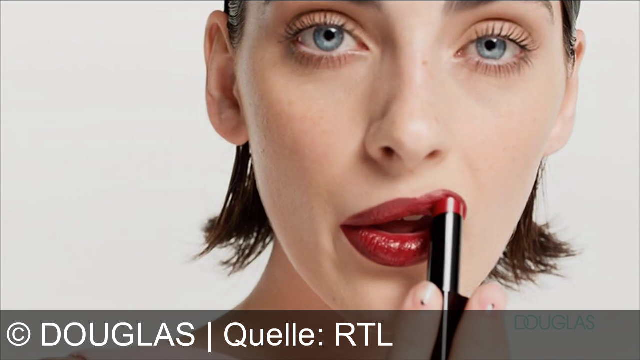 Eine Frau trägt roten Lippenstift auf. Sie hat blaue Augen und kurze Haare. Im Hintergrund ist alles weiß. Unten rechts steht "DOUGLAS".