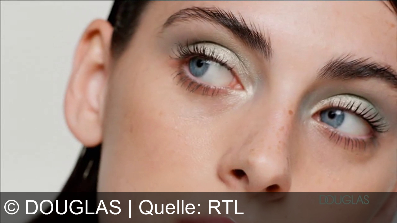Nahaufnahme eines Gesichts. Die Person hat blaue Augen und trägt silbernen Lidschatten sowie Wimperntusche. Die Haut wirkt glatt, die Lippen glänzen leicht. Unten rechts steht "DOUGLAS" in Türkis.