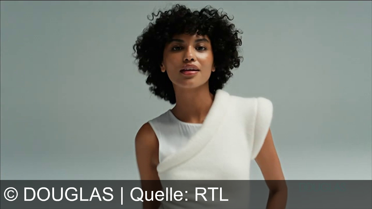Eine Person mit lockigem Haar trägt ein asymmetrisches, ärmelloses Oberteil in Weiß. Der Hintergrund ist neutral. Unten rechts steht "DOUGLAS".