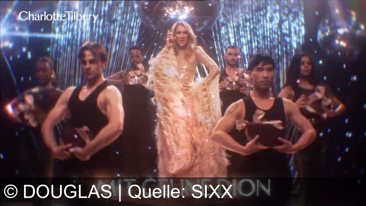Eine Frau in einem glamourösen Kleid steht in der Mitte, umgeben von mehreren Tänzern in schwarzen Outfits. Im Hintergrund befinden sich glitzernde Vorhänge und Lichter. Oben links steht "Charlotte Tilbury", unten "MIT CELINE DION".