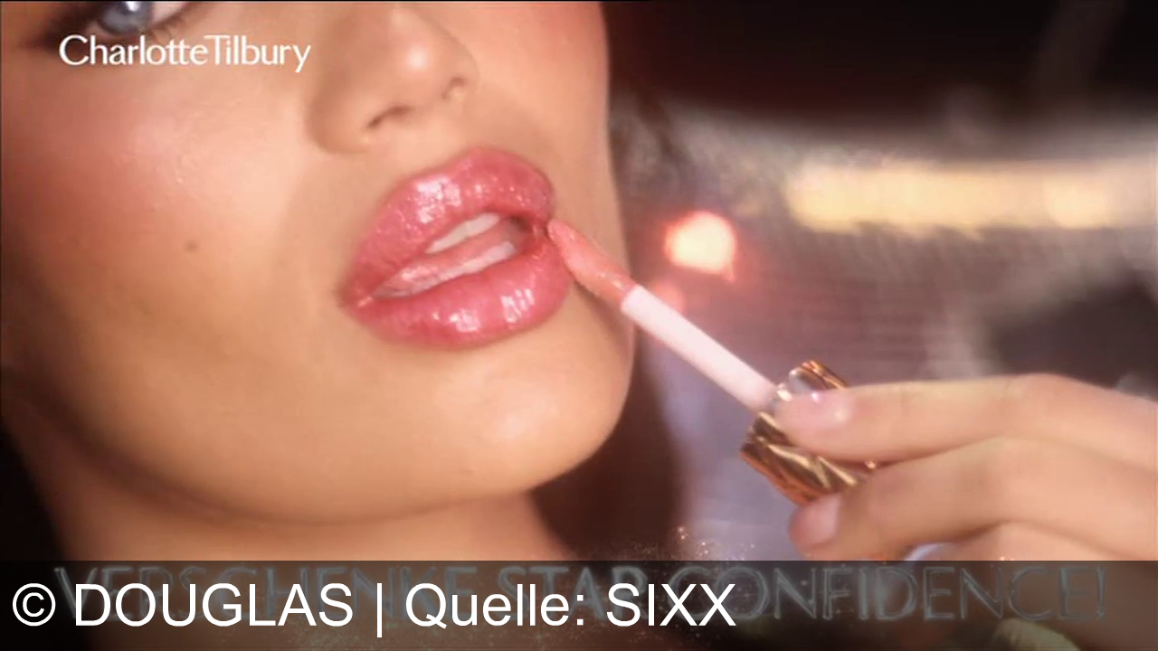 Eine Person trägt Lipgloss auf ihre Lippen auf. Der Text "Charlotte Tilbury" steht oben links. Unten sind die Wörter "VERSCHENKE STAR CONFIDENCE!" zu lesen. Die Szene ist nah und zeigt nur den unteren Teil des Gesichts und eine Hand.