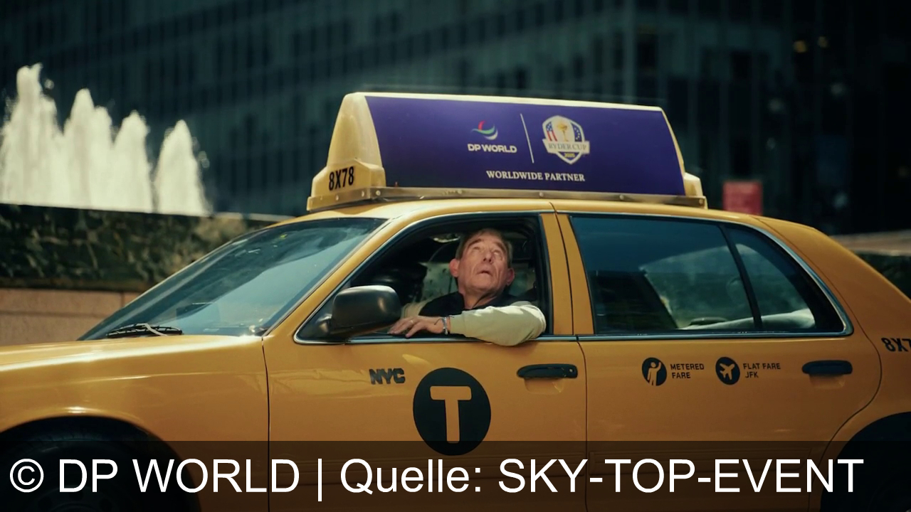 Ein gelbes NYC-Taxi steht in der Stadt. Ein älterer Mann sitzt am Steuer und schaut aus dem offenen Fenster nach oben. Auf dem Taxi-Dach leuchtet ein lilafarbenes Schild mit der Aufschrift „DP World“ und „Worldwide Partner“. Im Hintergrund sind verschwommen hohe Gebäude und Wasserfontänen zu sehen.