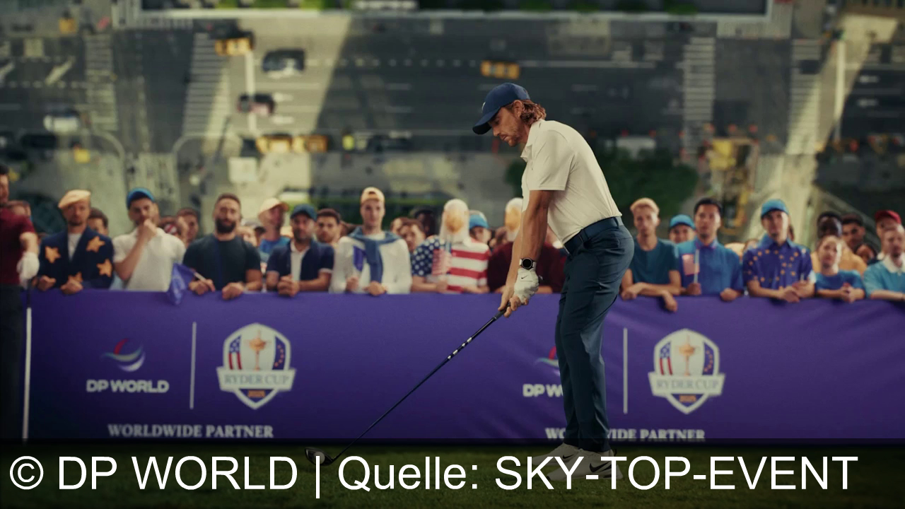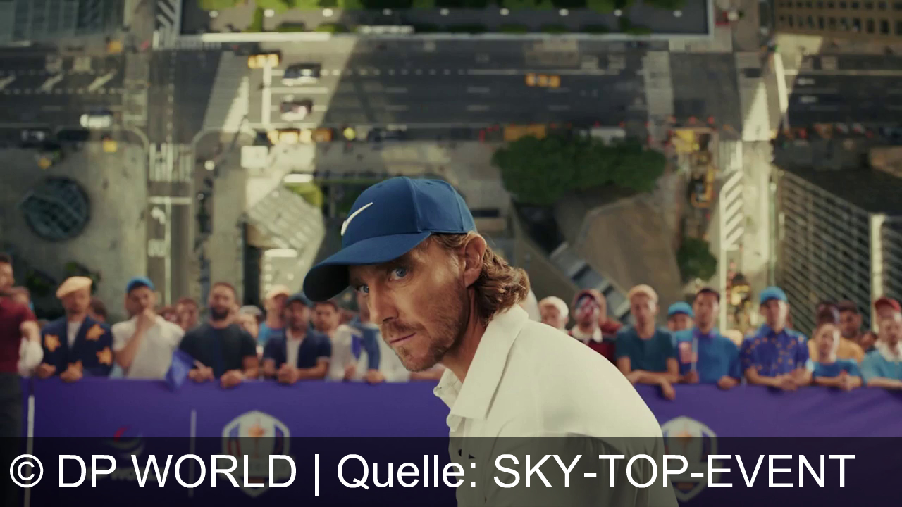 Ein Mann mit blauer Kappe und weißem Polohemd steht im Vordergrund. Hinter ihm ist eine Menschenmenge zu sehen, die gebannt zuschaut. Der Hintergrund zeigt eine stark verkleinerte, von oben gesehene Stadtszene mit Straßen und Gebäuden. Ein Banner mit den Logos von "DP World" und der "Ryder Cup" ist im Hintergrund sichtbar.