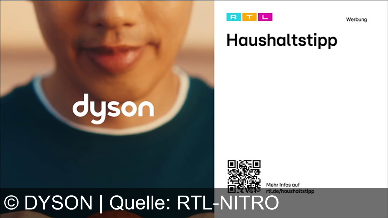Links sieht man den unteren Teil eines Gesichts mit einem Lächeln. Darunter steht "dyson" in weißer Schrift. Rechts oben ist ein RTL-Logo mit dem Wort "Haushaltstipp" daneben. Unten rechts ein QR-Code mit Text "Mehr Infos auf rtl.de/haushaltstipp".