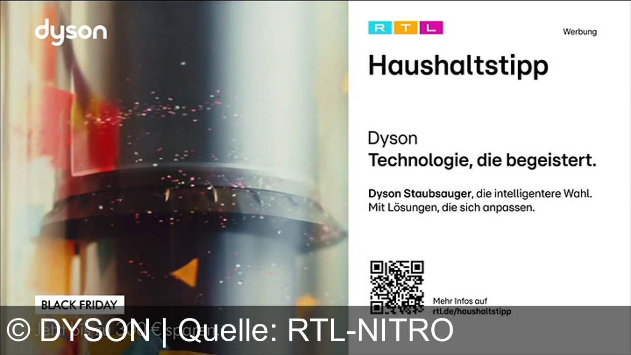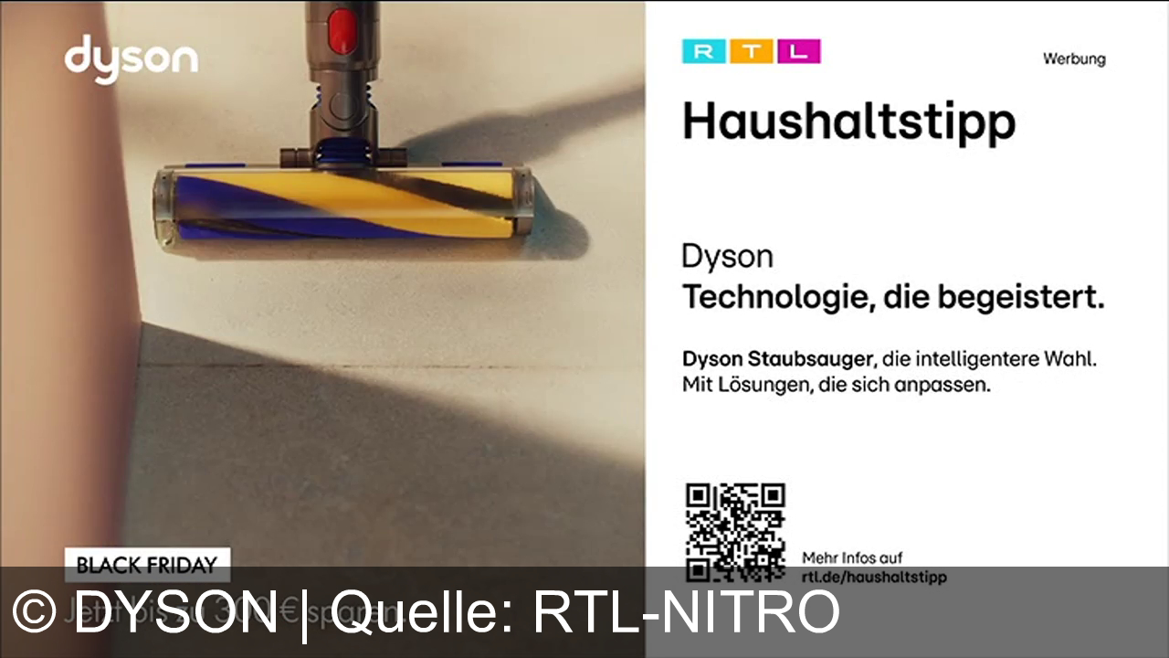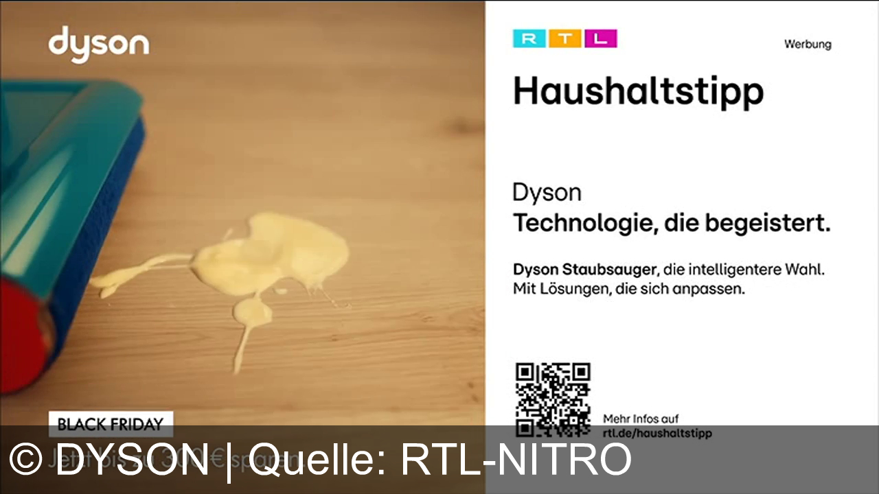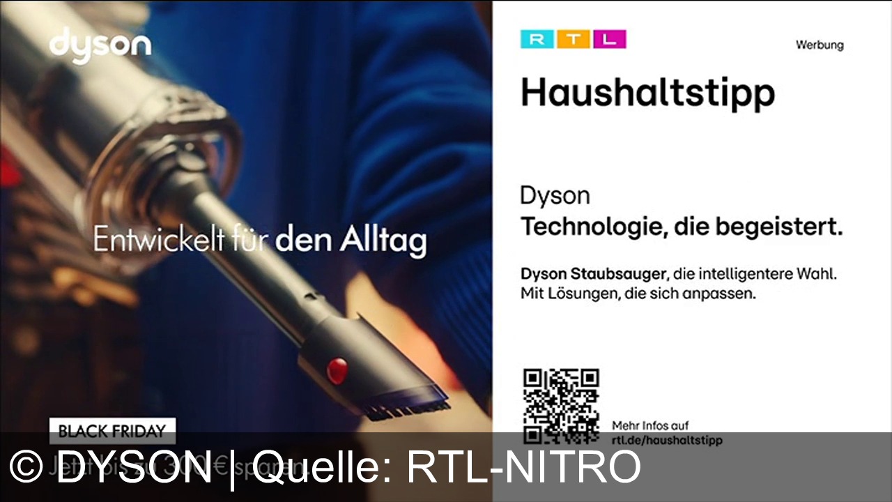 Dyson bewirbt intelligente Staubsauger, die sich flexibel an verschiedene Reinigungsanforderungen anpassen. Im Rahmen der RTL Haushaltstipps werden zum Black Friday Angebote mit bis zu 300 € Rabatt hervorgehoben. Die Werbebotschaft: Technologie, die begeistert und den Alltag erleichtert.