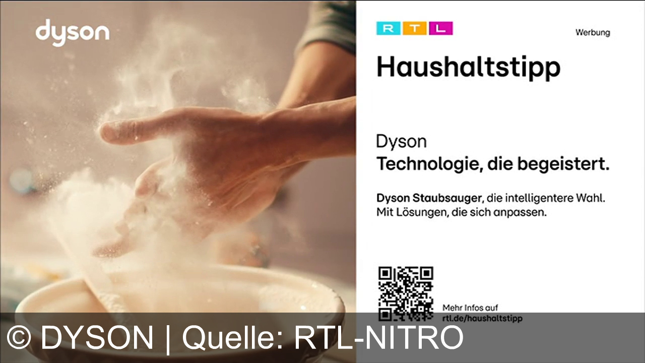 Zwei Hände mischen in einer Schüssel Mehl, Staub wirbelt. Links oben "dyson"-Logo. Rechts Werbung für Dyson mit Text über Staubsauger und QR-Code für mehr Infos auf rtl.de/haushaltstipp. Oben das RTL-Logo in bunten Farben.