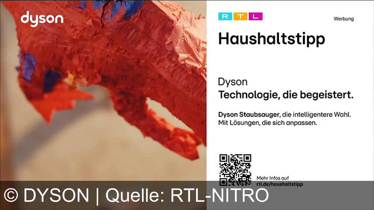 Links ist ein Teil einer roten Piñata zu sehen. Rechts steht “Haushaltstipp”, darunter “Dyson” und “Technologie, die begeistert.” Weitere Infos zu Dyson Staubsaugern und deren Vorteile. Oben das RTL-Logo und ein QR-Code führt zu weiteren Infos auf rtl.de/haushaltstipp.