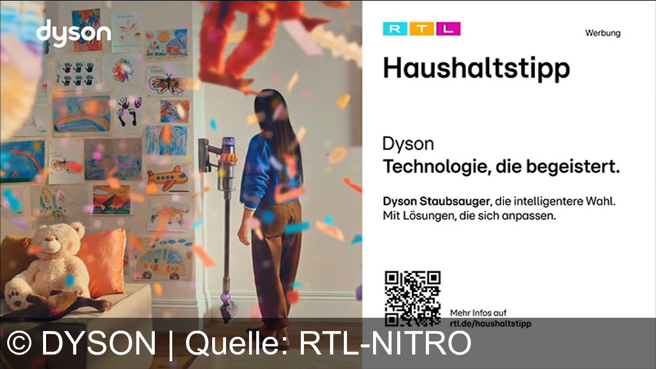 Links: bunter Raum mit Kinderzeichnungen an der Wand, ein Kind steht neben einem Dyson-Staubsauger, Konfetti fliegt. Kuscheltier auf der Couch. Rechts: RTL-Logo, "Haushaltstipp", Werbung für Dyson mit QR-Code. Text: "Technologie, die begeistert."