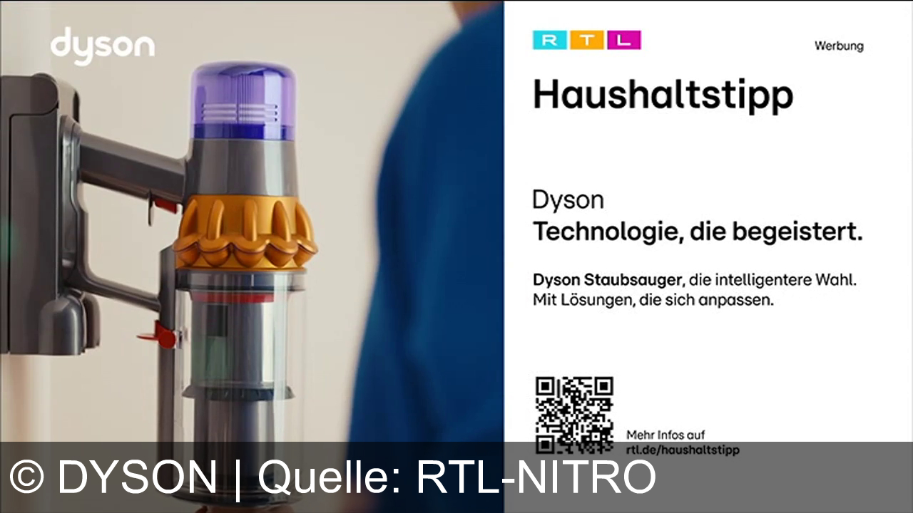 Links ein Dyson-Staubsauger, rechts Werbungstext: "Haushaltstipp", "Dyson Technologie, die begeistert". Beschreibung der Dyson-Staubsauger als intelligente Wahl mit anpassbaren Lösungen. Oben rechts Logos von RTL und "Werbung". QR-Code unten rechts, der auf weitere Informationen verweist.