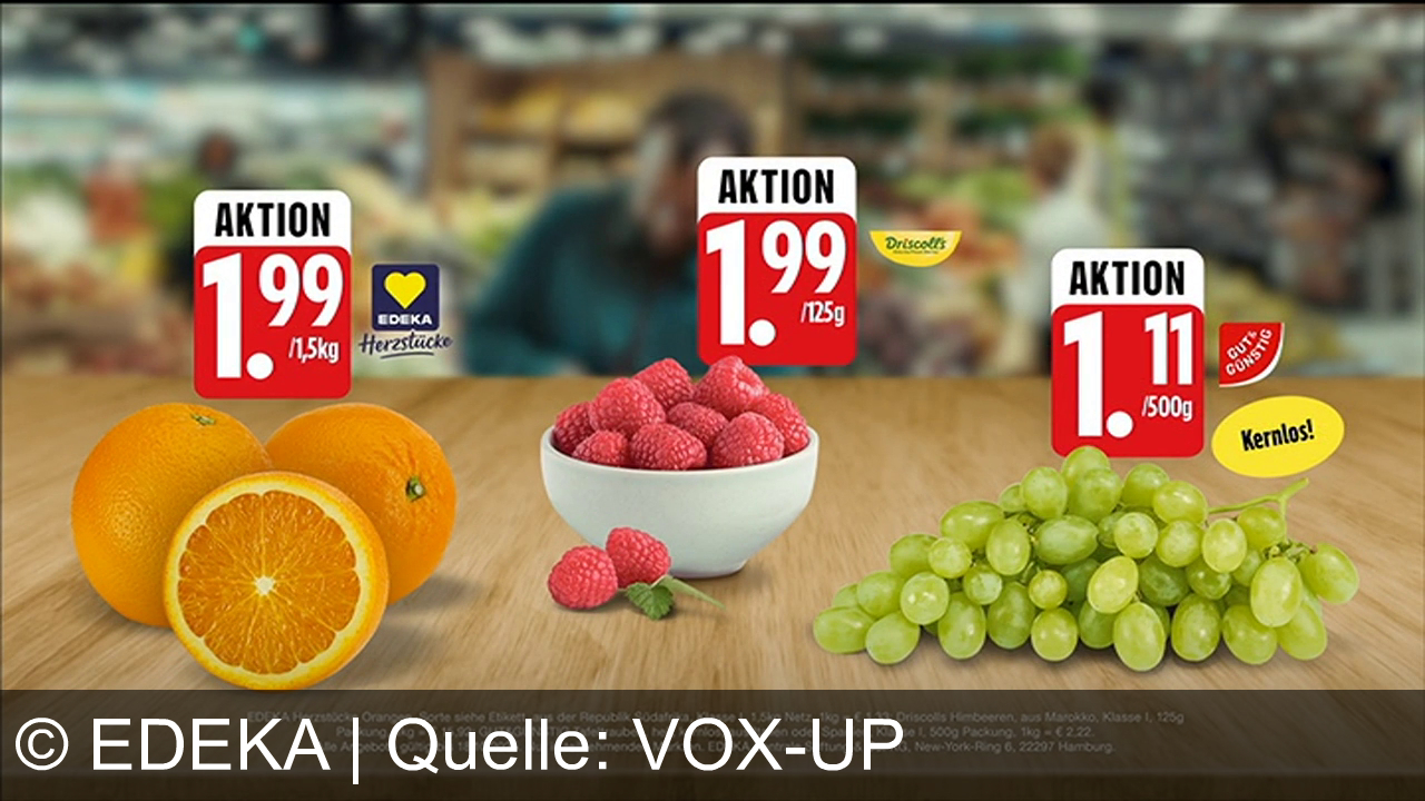Werbung aus dem Jahr 2025 von Edeka in Deutschland, mit dem von uns gewählten Titel: "Frische Orangen, Himbeeren und Trauben zu Aktionspreisen – nur bei EDEKA entdecken" mit der Kurzbeschreibung: "Aler! Nö, ganz frisch :) Frische Vielfalt bei EDEKA: Orangen, Himbeeren je 1,99 €, Trauben 1,11 €. Qualität, die begeistert – Wir lieben Lebensmittel!". Diese Werbung thematisiert oder beinhaltet die Kategorie/n Orangen, Lebensmittel, Supermarkt.
