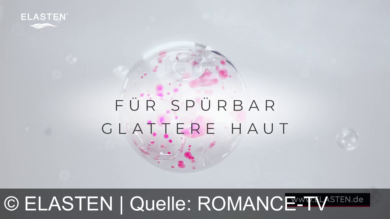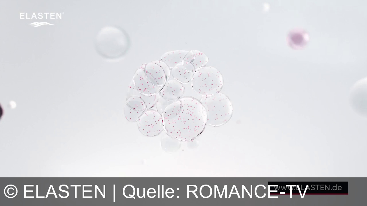 Mehrere transparente und rosafarbene Blasen schweben vor einem weißen Hintergrund. In der Mitte steht der Text "FÜR SPÜRBAR GLATTERE HAUT". Links oben ist das Logo "ELASTEN" und unten rechts "www.ELASTEN.de".