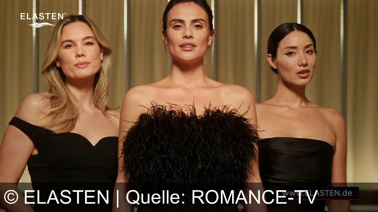 Drei Frauen in eleganten schwarzen Kleidern stehen nebeneinander. Links eine Frau mit blondem Haar, in der Mitte trägt die Frau ein Kleid mit Federn, rechts eine Frau mit dunklem, glattem Haar. Im oberen linken Eck steht "ELASTEN" und unten rechts die Website www.ELASTEN.de. Im Hintergrund sind beiger Vorhang oder Wände.