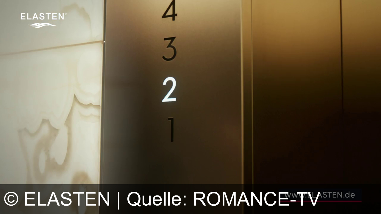 Ein Aufzugdisplay zeigt die Etagenzahlen 4, 3, 2, 1. Die Zahl 2 leuchtet. Links Marmorstruktur an der Wand, oben links steht "ELASTEN" mit einem geschwungenen Symbol darunter. Unten rechts eine Webseite: www.ELASTEN.de.