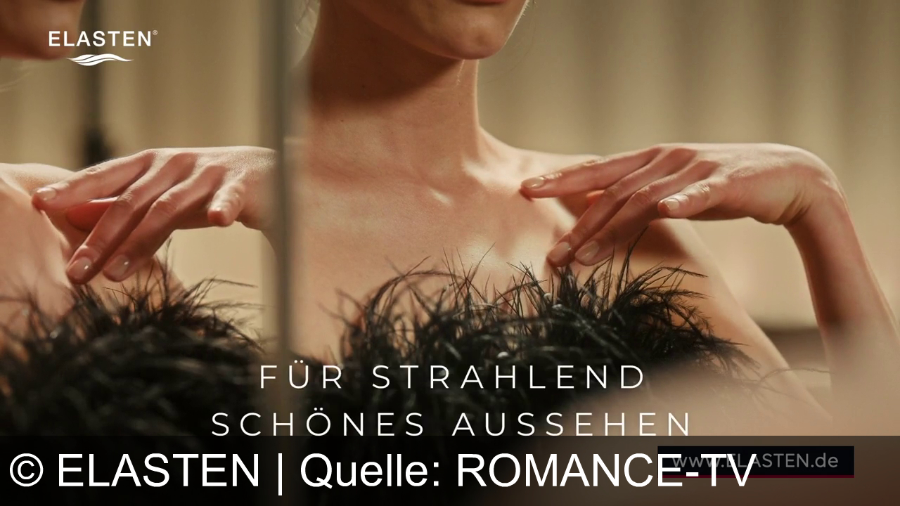 Eine Frau berührt ihr Dekolleté, das von einem Kleid mit schwarzen Federn umgeben ist. Der obere Bildbereich zeigt das Logo "ELASTEN". Unten im Bild steht der Text „FÜR STRAHLEND SCHÖNES AUSSEHEN“ und die Webseite „www.ELASTEN.de“. Der Hintergrund ist unscharf.
