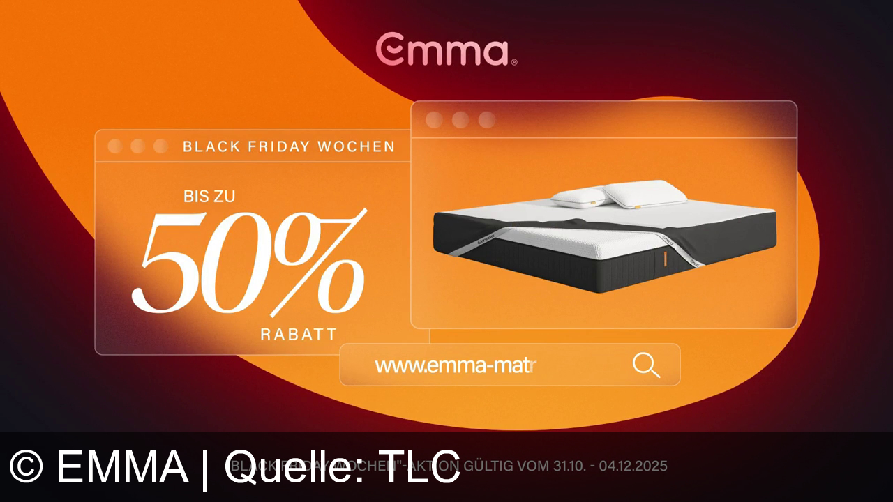 Die TV-Werbung von Emma bewirbt hochwertige Matratzen und Kissen, die während der Black Friday Wochen mit bis zu 50% Rabatt erhältlich sind. Beworben werden Schlafkomfort und eine einfache, schnelle Bestellung online oder im Geschäft – für erholsamen Schlaf zum Vorteilspreis.