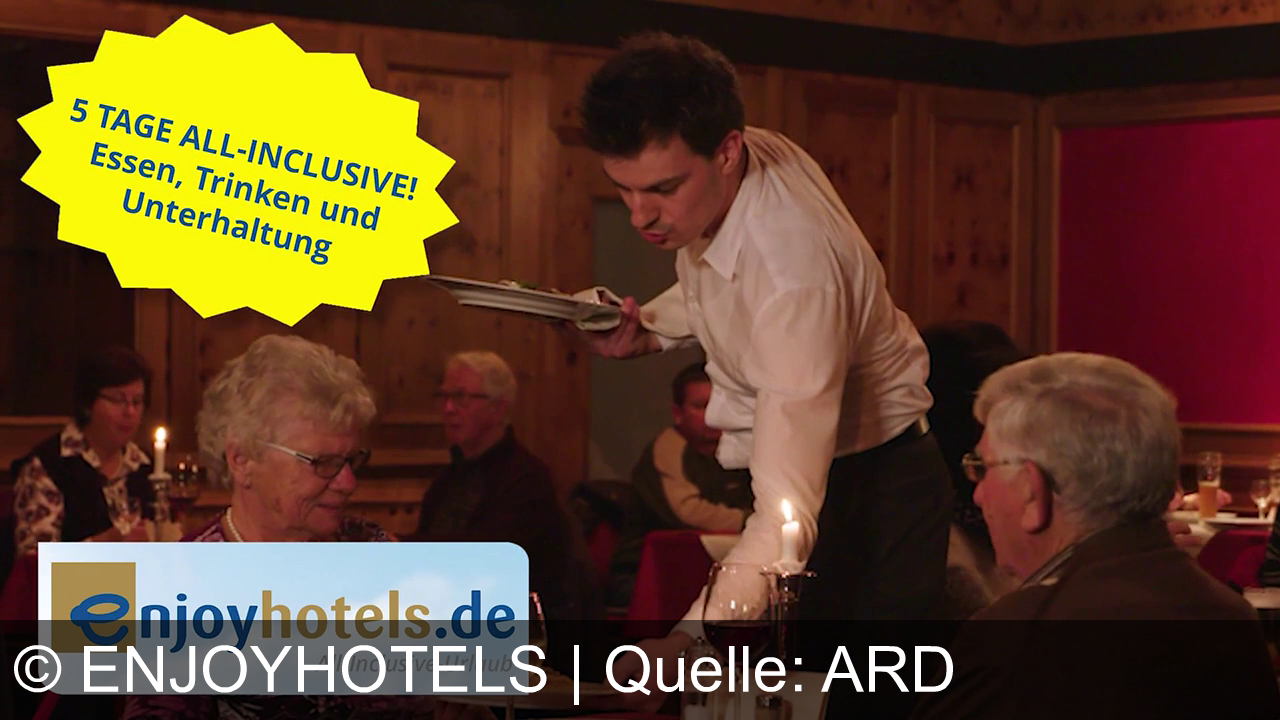 In einem Restaurant serviert ein Kellner Essen. Zwei ältere Personen sitzen am Tisch mit Kerzen und Weingläsern. Im Hintergrund andere Gäste. Gelbes Schild mit Text: „5 TAGE ALL-INCLUSIVE! Essen, Trinken und Unterhaltung“. Unten Logo: „enjoyhotels.de“.
