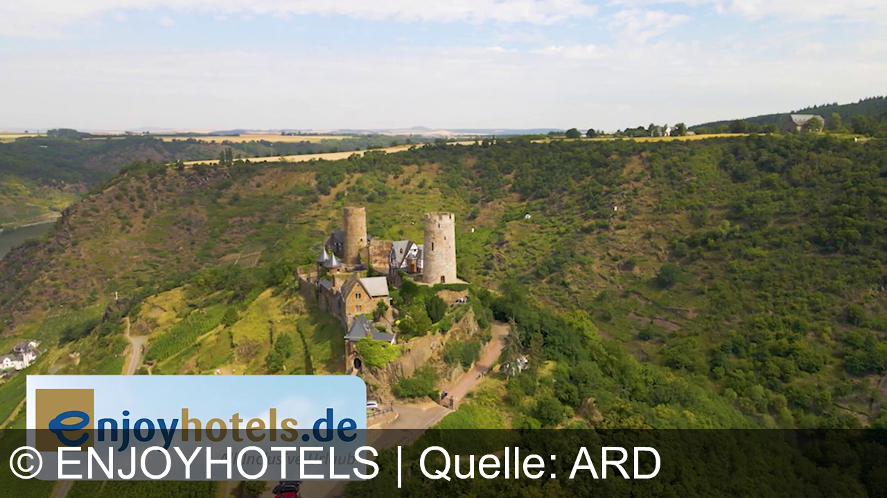Eine Burg mit zwei runden Türmen thront auf einem grünen Hügel. Die Landschaft ist von Wiesen und Wald umgeben. Unten rechts ist das Logo "enjoyhotels.de" mit dem Slogan "All-Inclusive-Urlaub" eingeblendet. Der Himmel ist leicht bewölkt.