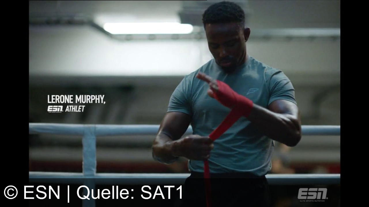 Ein Mann mit grauem T-Shirt bandagiert sich die Hände mit rotem Tape. Im Hintergrund sind Boxseile zu sehen. Links steht der Name "Lerone Murphy" und die Worte "ESN Athlet". Unten rechts ist das Logo von ESN abgebildet.