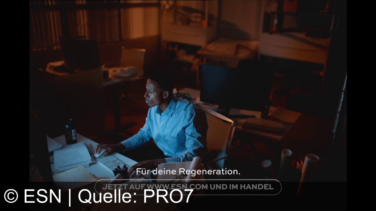 Ein Mann sitzt an einem Schreibtisch in einem abgedunkelten Raum, beleuchtet vom Bildschirm. Auf dem Tisch liegen Papiere und eine Flasche. Im Bild steht der Text: „Für deine Regeneration. Jetzt auf www.esn.com und im Handel“.