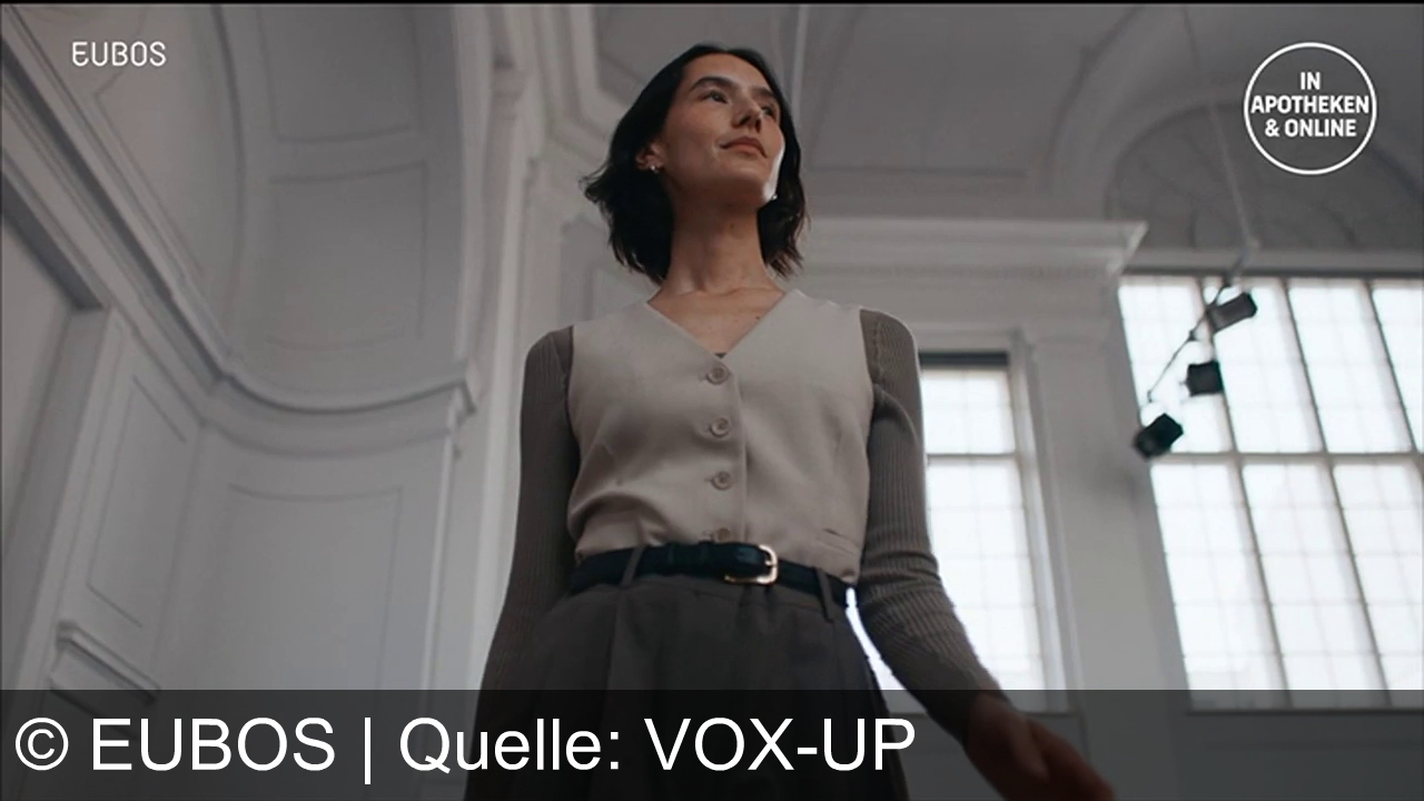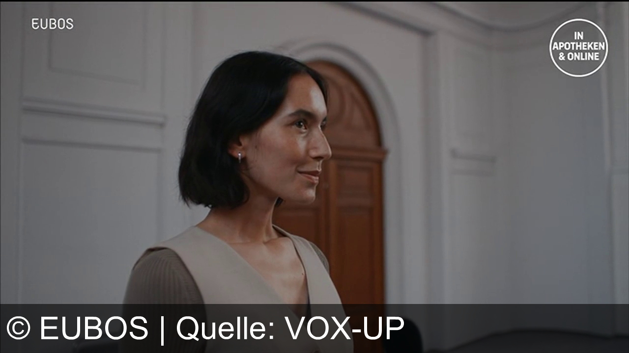 Eine Frau mit kurzer, dunkler Haaren trägt eine beige Weste über einem langärmeligen Oberteil und einem schwarzen Gürtel. Der Hintergrund zeigt einen hellen Raum mit hohen Decken und großen Fenstern. Links oben steht "EUBOS" und rechts oben befindet sich ein runder Text mit "IN APOTHEKEN & ONLINE".