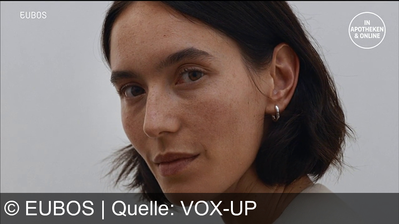 Eine Person mit kurzen, dunklen Haaren und Ohrring schaut direkt. Der Hintergrund ist einfarbig grau. Oben links steht "EUBOS" und oben rechts ein rundes Logo mit "IN APOTHEKEN & ONLINE".