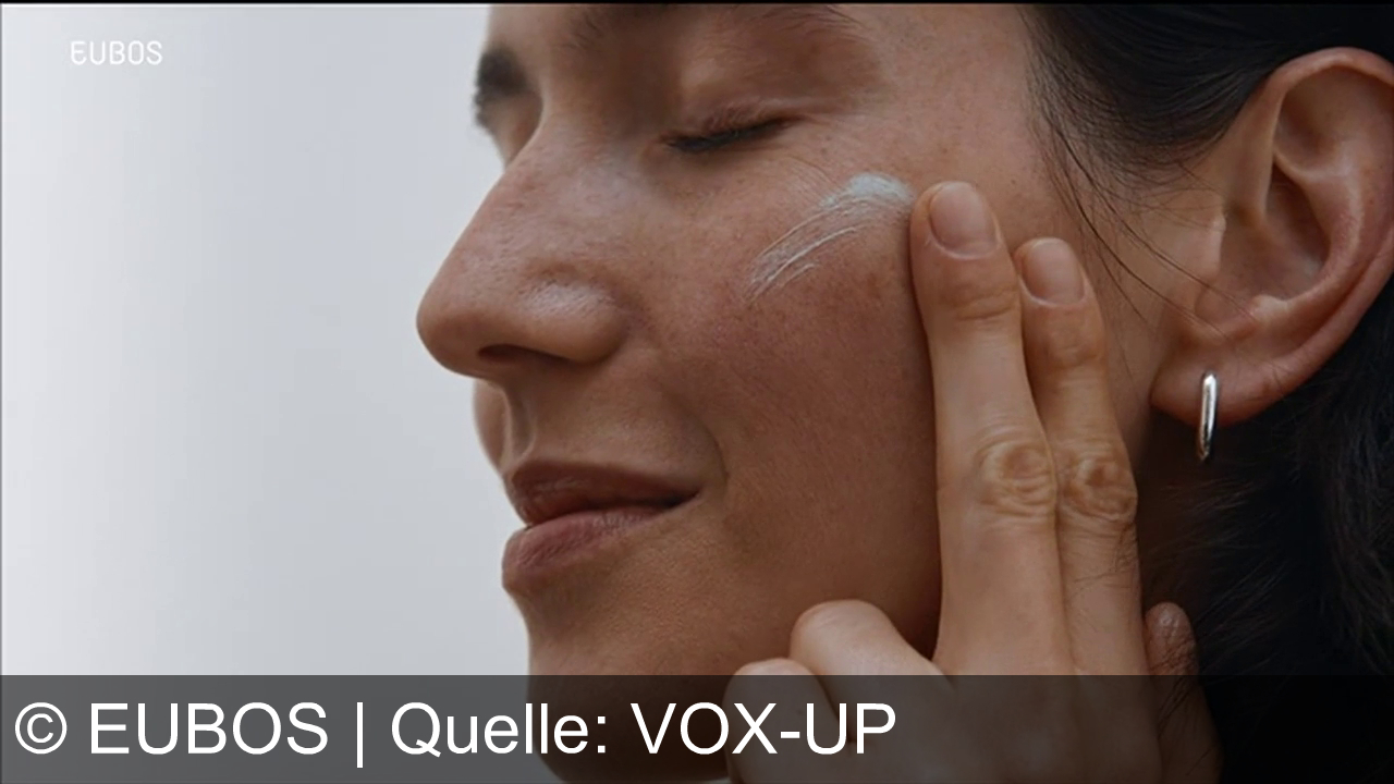 Eine Person trägt cremefarbene Substanz auf die Wange auf, Augen geschlossen, leichtes Lächeln, Ohrstecker sichtbar. Hintergrund hell und neutral. Oben links steht "EUBOS".