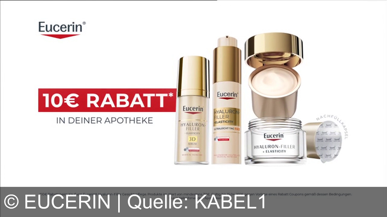 Eucerin Werbung aus dem Jahr 2026 in Deutschland, mit dem von uns gewählten Titel: "Eucerin Hyaluron-Filler + Elasticity LSF 50: Anti-Age-Innovation jetzt mit 10€ Rabatt!" mit der Kurzbeschreibung: "Eucerin Hyaluron-Filler + Elasticity: Mehr Elastizität, weniger Pigmentflecken. Mit patentiertem Thiamidol. Jetzt 10€ in Ihrer Apotheke sparen.". Diese Werbung thematisiert oder beinhaltet die Kategorie/n Apotheke, Creme, Hautcreme, Kosmetik, Pflege.