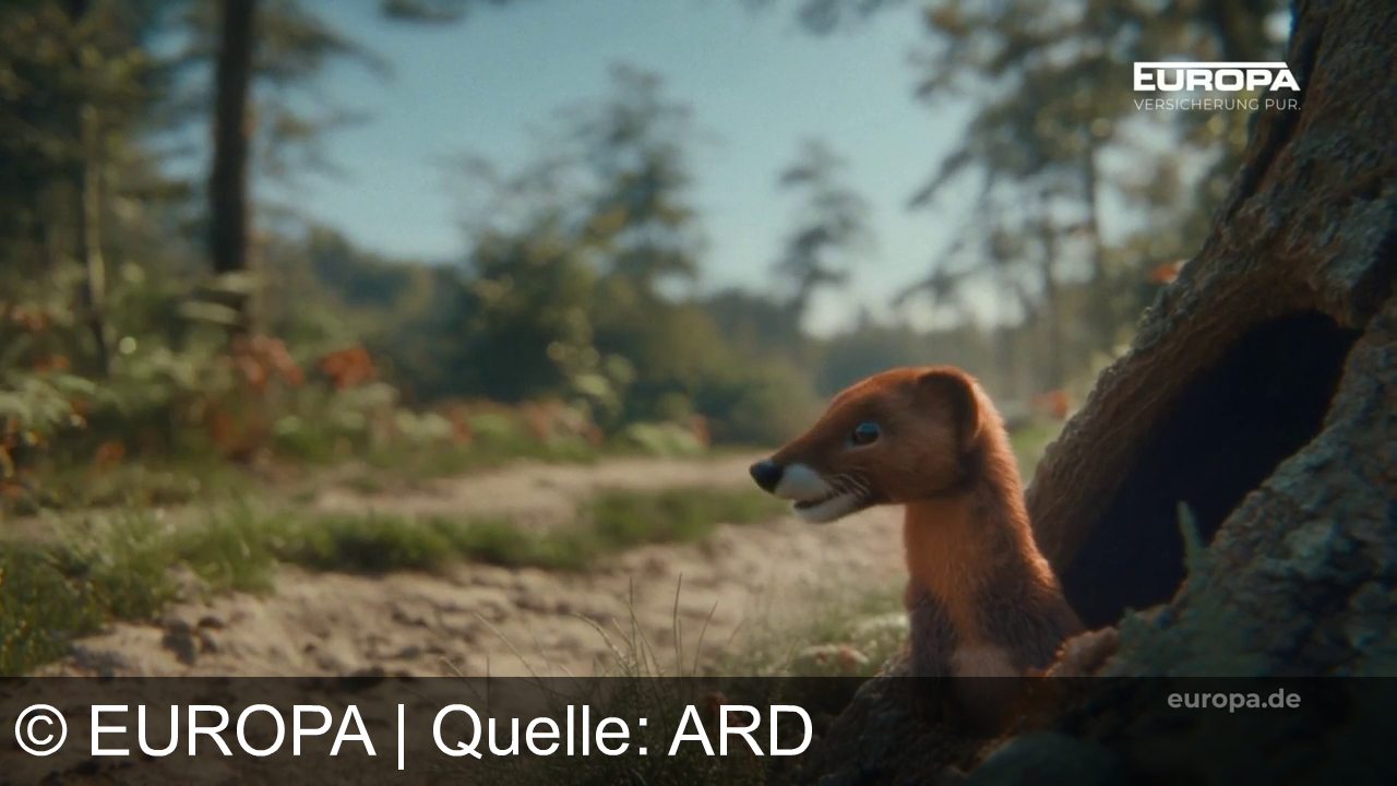 Ein animiertes, braunes Wiesel sitzt vor einem Baumstamm. Im Hintergrund sieht man einen Wald mit Bäumen und Sträuchern. Rechts oben steht "EUROPA VERSICHERUNG PUR." und unten rechts "europa.de". Die Szene wirkt wie ein sonniger Tag in der Natur.