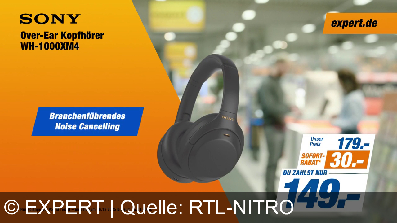 Sony Over-Ear Kopfhörer WH-1000XM4 mit branchensführendem Noise Cancelling. Preis: 179 €, Sofort-Rabatt von 30 €, Endpreis 149 €. Hintergrund mit unscharfen Personen in einem Geschäft. Angebotszeitraum: 26.12.2025 bis 05.01.2026. Website expert.de.