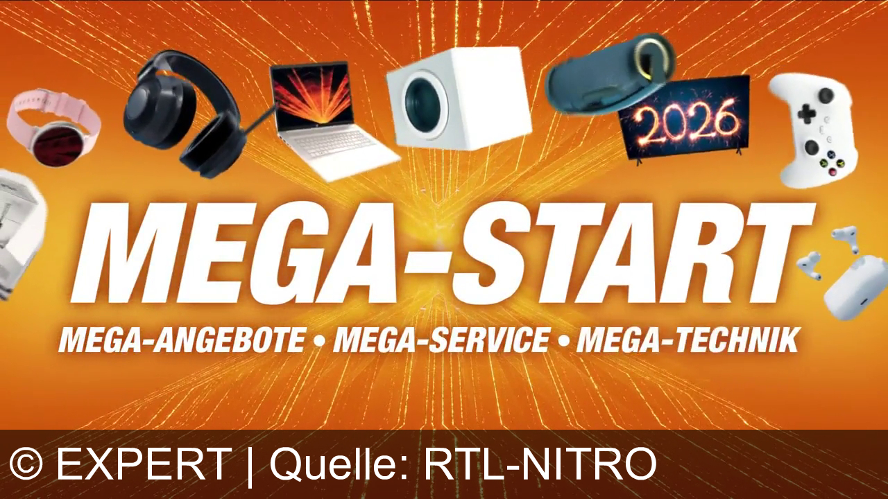 Orange Hintergrund mit technologischem Flair. In der Mitte steht „MEGA-START“ in großen weißen Buchstaben. Darunter: „MEGA-ANGEBOTE • MEGA-SERVICE • MEGA-TECHNIK“. Umgeben von Bildern von Technikgeräten: Kopfhörer, Laptop, Waschmaschine, Lautsprecher, TV mit „2026“, Controller, Smartwatch, In-Ear-Kopfhörer.
