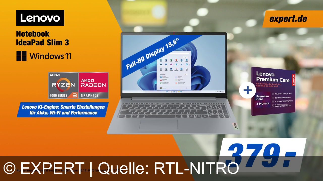 Ein Lenovo IdeaPad Slim 3 Notebook mit Windows 11 und AMD Ryzen 3 präsentiert. Full-HD Display mit 15,6 Zoll. Links Infos zur Lenovo KI-Engine. Rechts Lenovo Premium Care für 3 Monate. Preis 379 Euro. Hintergrund verschwommen, Logo von expert.de oben rechts. Gültigkeit der Aktion vom 26.12.2025 bis 05.01.2026.