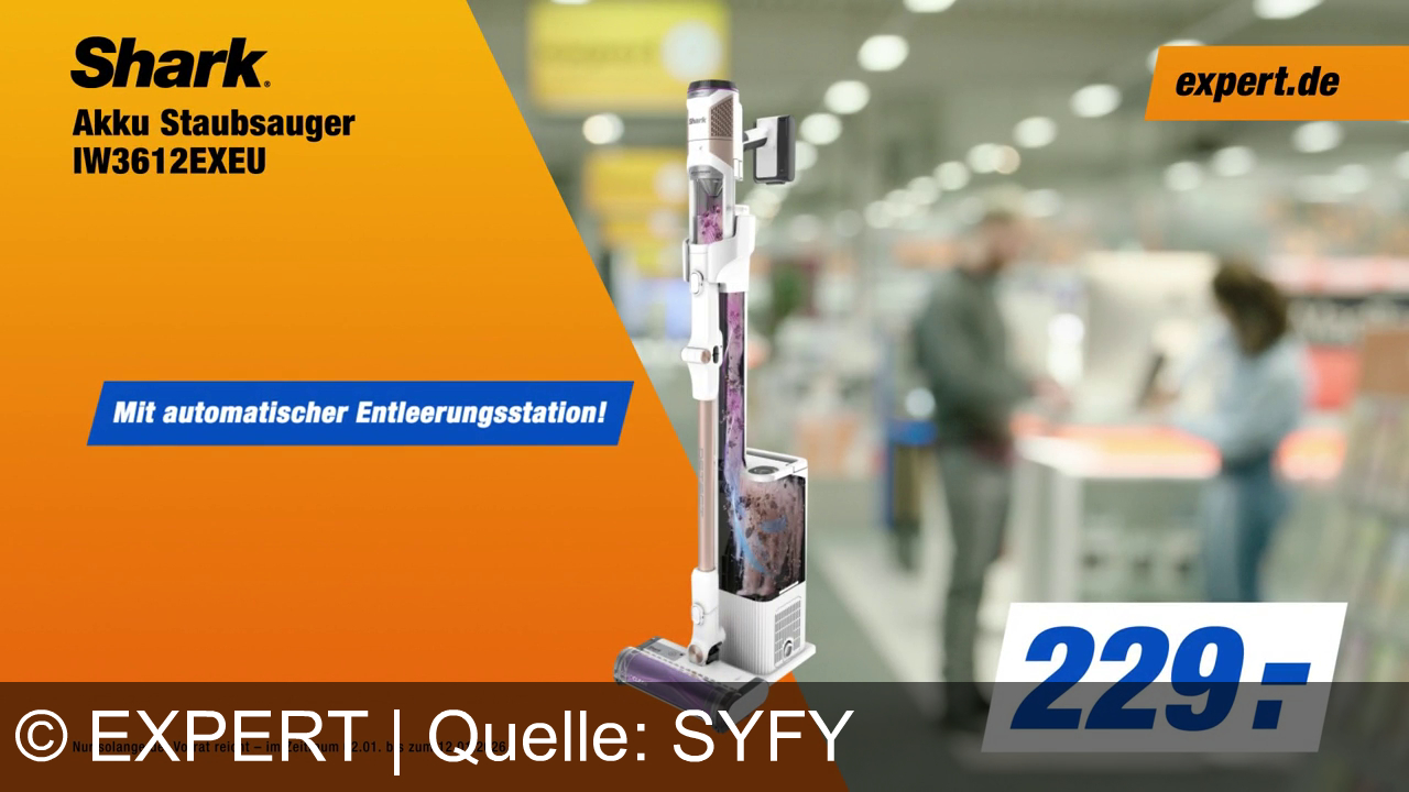 Ein kabelloser Shark Staubsauger IW3612EXEU wird beworben. Preis: 229 Euro. Links ein orangefarbener Hintergrund mit dem Text "Mit automatischer Entleerungsstation!" und "expert.de" im Eck. Im Hintergrund unscharfe Personen in einem Geschäft. Angebote gültig bei Vorrat vom 02.01. bis 12.01.2026.